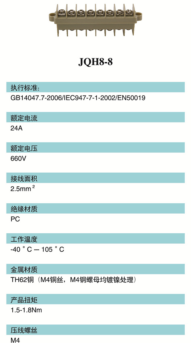 JQH8系列繼電保護(hù)端子,是為國(guó)內(nèi)外繼電保護(hù)裝置而開(kāi)發(fā)的電流端子;主要應(yīng)用于各類電力,電子,儀器裝置、繼電保護(hù)裝置等機(jī)箱穿墻類型電路進(jìn)出線連接,適用導(dǎo)線2.5mm2,其設(shè)計(jì)合理,結(jié)構(gòu)緊湊,接線直觀可靠,使用方便,端子絕緣材料采用高性能PC工程塑料,阻燃達(dá)到UL94-V0級(jí),電氣機(jī)械性能良好,導(dǎo)電體和組合螺釘標(biāo)配銅合金螺釘,能確保產(chǎn)品保持有效的氣密度,低阻值,永久性連接,保證接線的可靠。被廣大工程師選用;有多種規(guī)格可供選擇,還可根據(jù)客戶要求開(kāi)發(fā)相應(yīng)的回路端子。(JQH8-8P、JQH8-10P 、JQH8-12P、JQH8-16P)等。