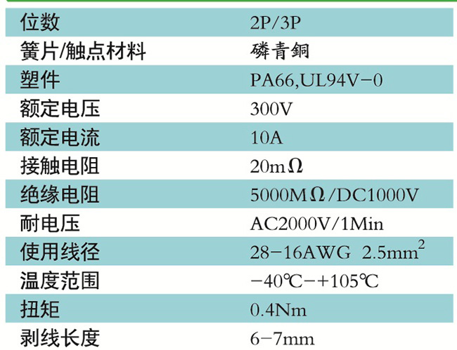 接線端子的絕緣材料用改性的尼龍(PA66),能達到或超過IEC947-7-1EN60947-7-1標準,阻燃等級達到UL94,V-0具有良好的電氣性能和機械性能。螺絲用高強度的鋼制成鍍鋅或鎳處理,導電體四方針用合金銅制成表面鍍錫,壓片采用彈性及極強的磷青銅表面鍍錫或鎳;壓線框用抗應力裂縫腐蝕的合金銅制成,這些金屬表面還鍍錫或鍍鎳加以保護。設計完全符合IEC60947-7-1.GB14048.7等標準。